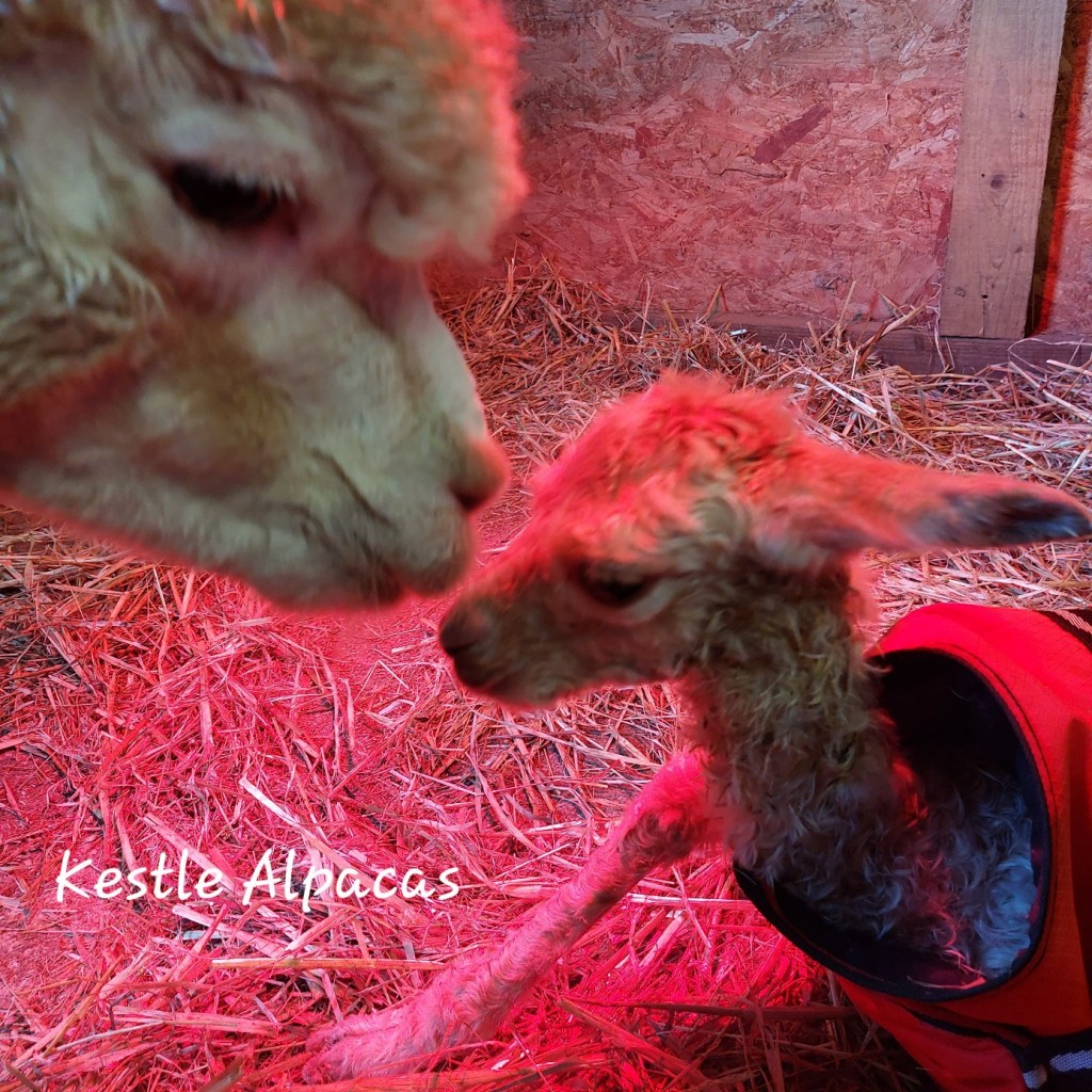 The Boy was born a week later. His mum, being her first time, was showing signs of stress and we monitored closely. She gave birth, didn’t need intervention which is good news. The Boy looked really long, really big next to his mum, and all seemed alright. Even though the morning was sunny, shy sun of autumn, it was rather cold. He started shivering before he stood up. So I had to take him in the barn, put him under the IR light and hope he’d pick up. Some minutes later, there was little improvement. I held him up and put him to feed from mum, but he needed to be supported, he couldn’t stand up. That Sunday I spent it making sure mum and cria were bonding, that he was getting his colostrum and staying warm, supplementing with bottle after each feed every two hours to make sure he took a better chance.
