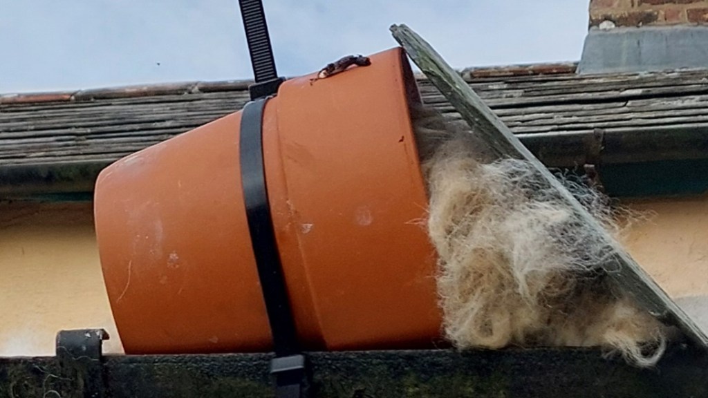 And the little birds keep on messing with the tiles in the roof making nests. We had to come up with a solution to cover the gap where they nest and bring the chicks out with the nest somehow. Credit to the two hard working men that came up with the idea to save roof and chicks. Check out the contribution of the alpaca fibre. Very clever!