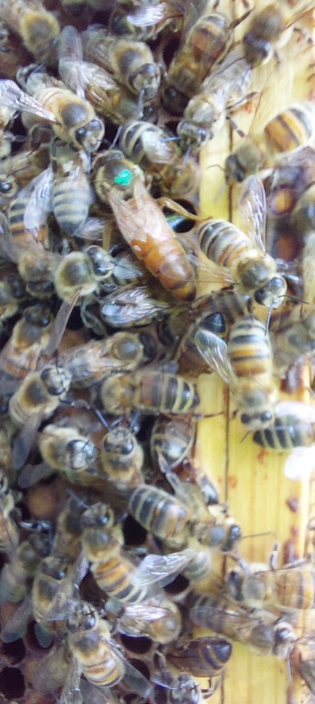 Can you see the queen? We marked her in green earlier in the year.
